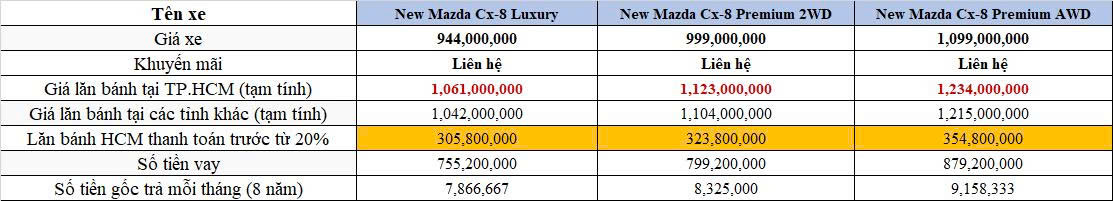 GIÁ LĂN BÁNH XE nEW MAZDA CX-8 2025 CÁC PHIÊN BẢN tháng 01/2026